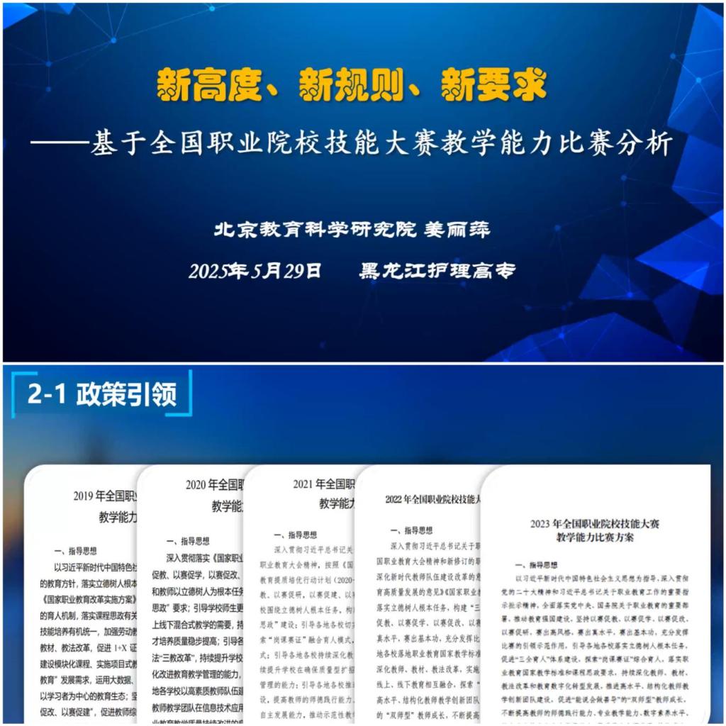 为深入贯彻《教育强国建设规划纲要(2024—2035年)》精神,全面落实党中央、国务院关于职业教育的重要部署,提升教师教学能力和专业素养,推动教育教学改革,充分发挥大赛示范引领作用。近期,学校教务处、人事处(教师工作部 教师发展中心)联合举办了2025年教学能力比赛备赛专题培训会,精准把握教学能力比赛要求与动态,助力教师高效备赛,拓展赛教协同促发展新路径。培训开展线上线下系列专题讲座,内容分别聚焦政策解读、技术应用和材料准备三大模块,特邀相关专家带来针对性指导,着力提升教师材料准备的规范性、科学性,增强参赛作品的竞争力。