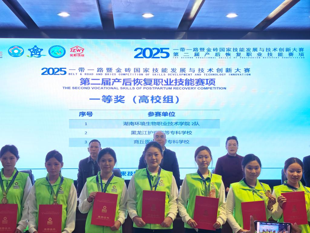2025年一带一路暨金砖国家技能发展与技术创新大赛“第二届产后恢复职业技能”赛项于11月27日至12月1日在湖南衡阳圆满举办。经过激烈角逐,我校护理系李萱、王子璇、赵鑫鑫三名同学,在刘慧、邰东玲老师的悉心指导下,凭借扎实的专业理论、精湛的操作技能和出色的临场表现,从全国32支参赛队伍中脱颖而出,勇夺大赛一等奖,充分展现了我校学子的卓越风采和学校的育人成效。