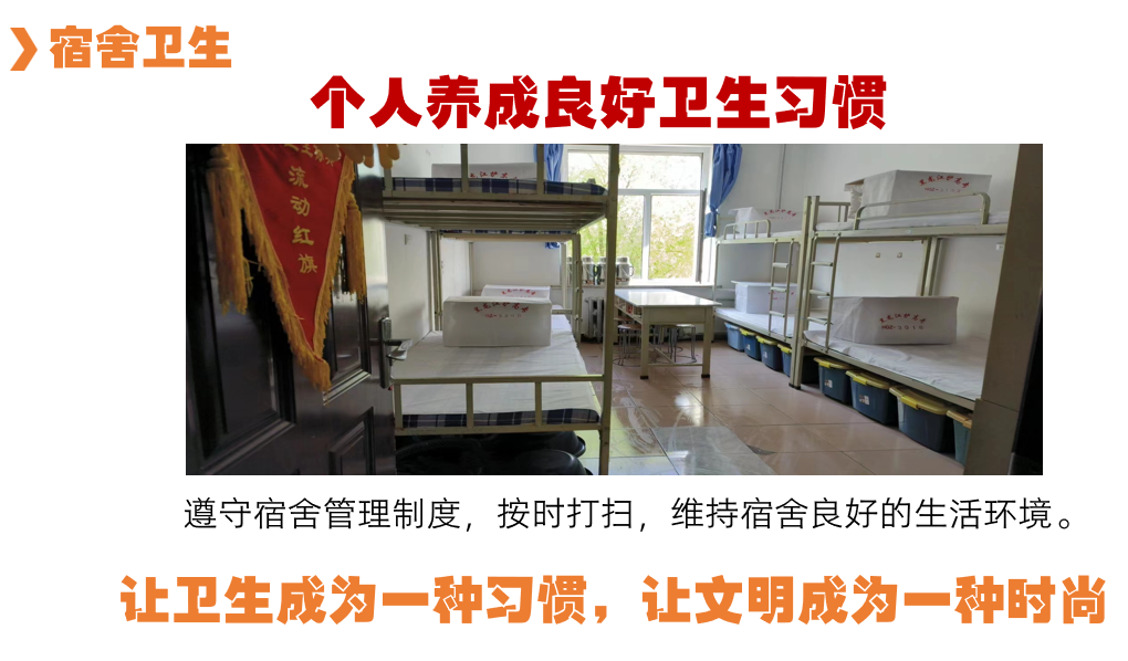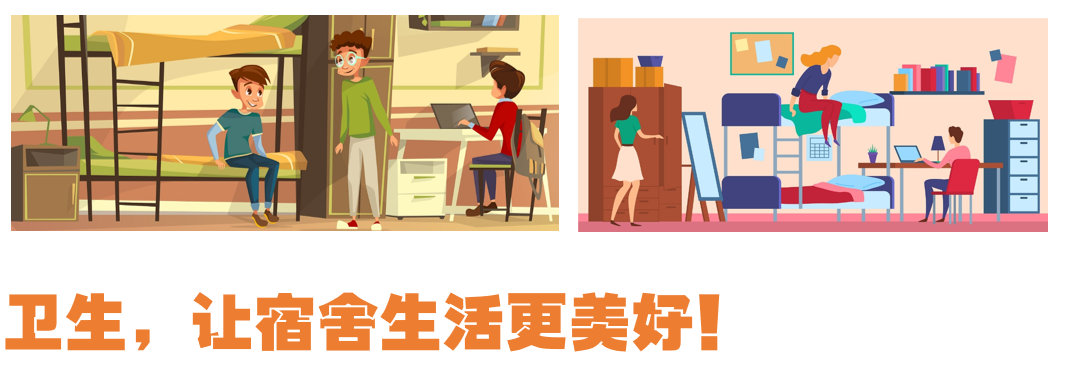 一个宿舍的卫生环境,是宿舍内每个成员共同来营造的,我们要像爱自己的家一样,保持宿舍的整齐、整洁、舒适。