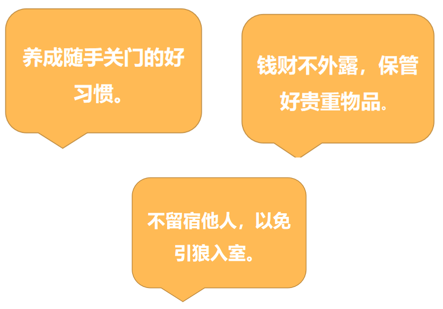 宿舍楼作为学生集体生活的主要场所,进出人员多且杂,同学们应自觉维护宿舍安全,增强安全意识,提高防范和自我管理能力,及时劝阻、制止有损于宿舍安全的不良行为,注意进出宿舍的外来人员,如遇可疑情况,请同学们主动查问并及时向值班人员、保卫部门报告。
