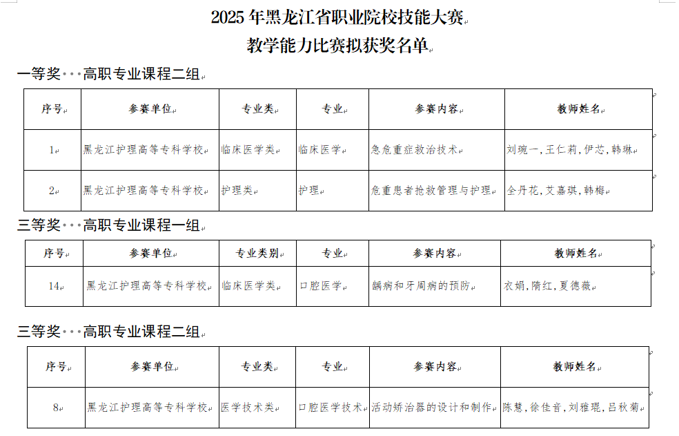 技耀黑龙江职教,彰显康养护风采!近日,由黑龙江省教育厅主办的2025年黑龙江省职业院校技能大赛教学能力比赛决赛在黑龙江职业学院举行,在这场代表省内职业院校教学能力最高水平的赛事中,我校教师团队凭借深厚的专业素养、创新的教学设计与卓越的现场表现,勇创佳绩,充分彰显了我校“康养护融合式”集群化发展特色和“三导三进三融合”人才培养模式在深化教育教学改革中的育人成效。