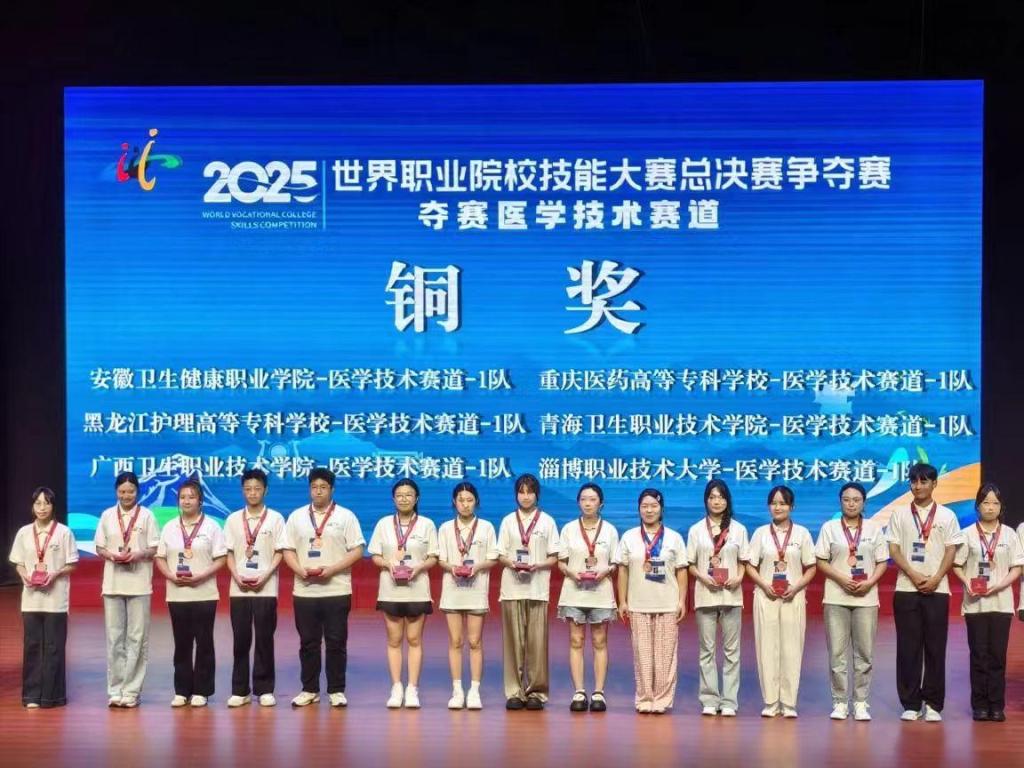 2025年世界职业院校技能大赛医学技术赛道于8月20日至21日在河南省信阳市信阳职业技术学院隆重举行,我校由临床医学专业23级的楚佳欣、潘婷婷、辛艾嘉、周美轩组成的参赛队伍,在指导老师刘博和张葳的悉心指导下,凭借扎实的专业知识、娴熟的操作技能和默契的团队配合,经过激烈角逐,成功摘得铜奖,为学校争得了荣誉!